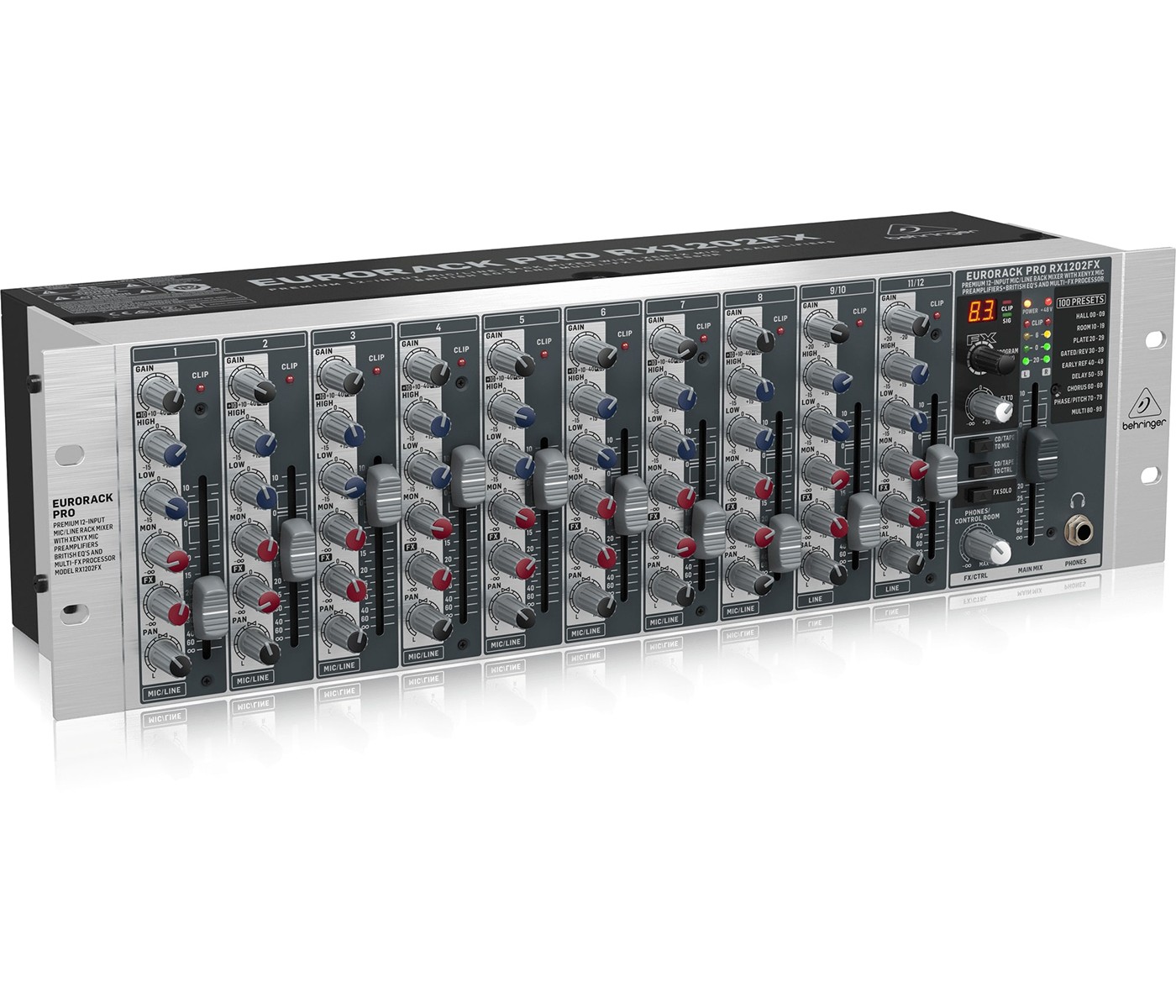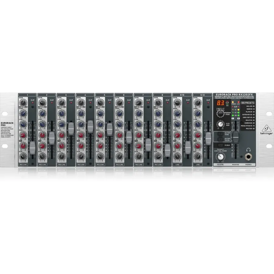 Every RX1202FX mixer features our 24-Bit Multi-FX processor, with 100 awesome presets including reverb, chorus, flanger, delay, pitch shifter and various multi-effects. Complete with highly-accurate Signal and Clip LEDs, these effects are instantly available at your fingertips via the Program selector control.