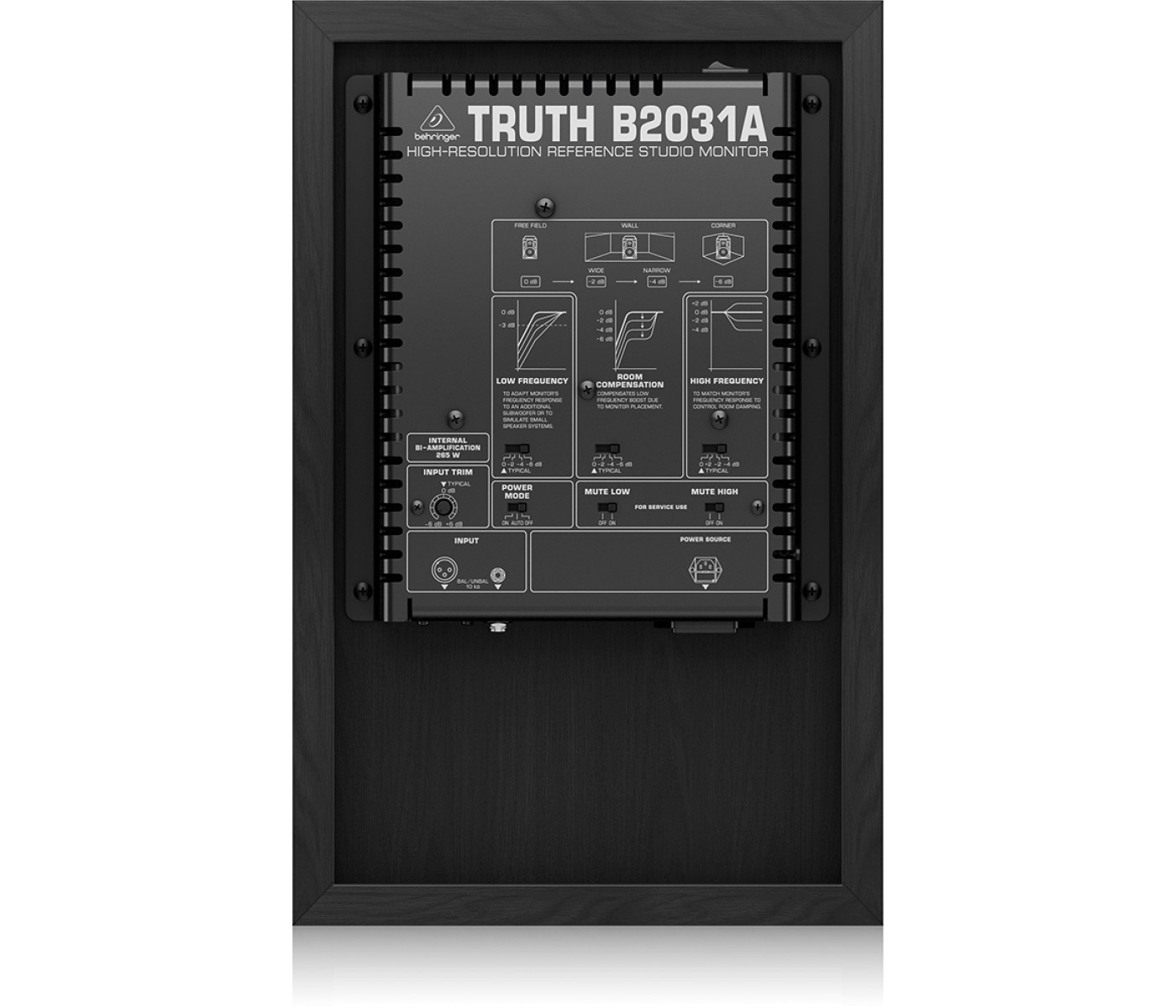 Monitor placement is also critical. Ideally, all loudspeakers should be placed away from walls to ensure proper bass response. The B2031A features a set of Room Compensation switches so you can place it against walls, or even in corners. Walls tend to enhance low-frequency content, and corners exaggerate bass even more, but your B2031A TRUTH can be custom-tailored to provide honest bass response for your situation, with the simple flick of a switch or two.