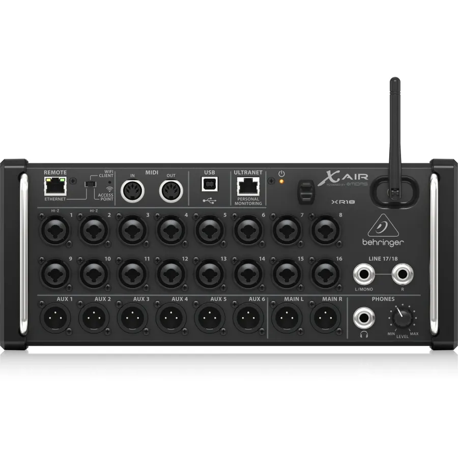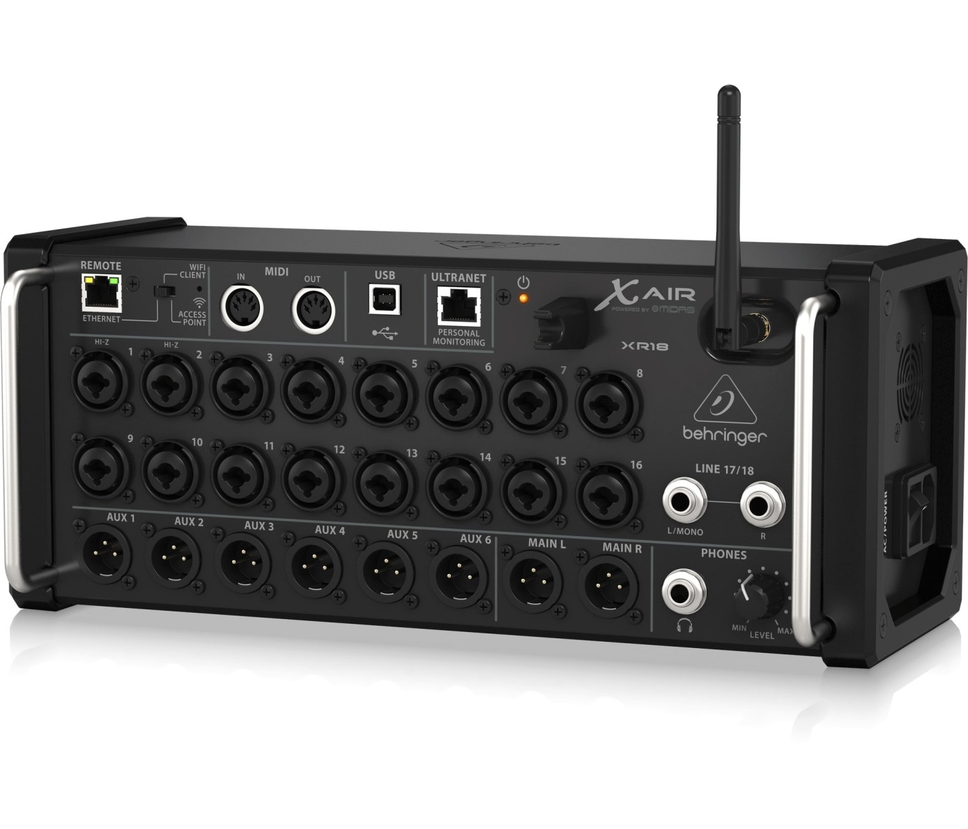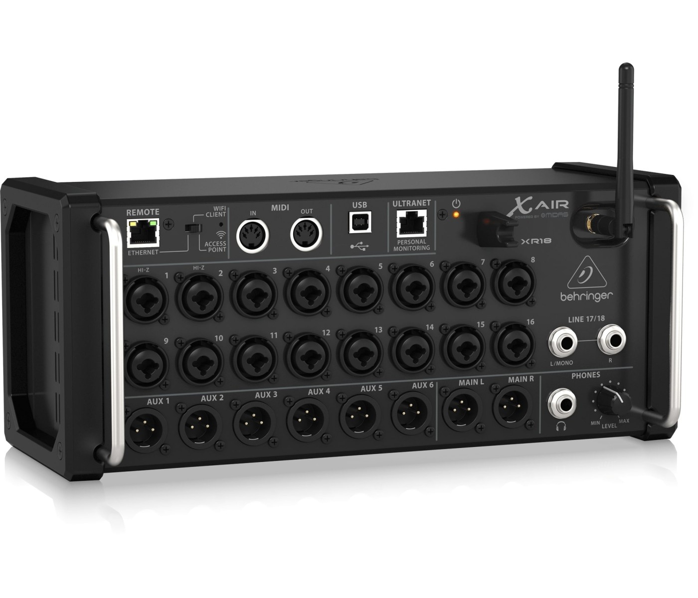 Behringer’s cutting-edge X Air digital mixers integrate with your iPad or Android tablet for unprecedented mixing power and mobility. Plug in your mic and line level sources and mix from anywhere in the venue or studio via the free remote control app. The XR18 is an 18-input, rackmountable stage box unit with 16 gain-programmable Midas-designed microphone preamps, two hi-Z inputs, Behringer’s renowned X32 effects rack, a 100-band Real Time Analyzer on all channel and bus EQs, an 18 x 18 USB interface, and integrated Wi-Fi, all in a convenient rackmount chassis. Just add mics, and you have everything you need to mix a live show and record pristine multitrack sessions straight to your DAW. The Behringer XR18 gives you a whole new way to mix.