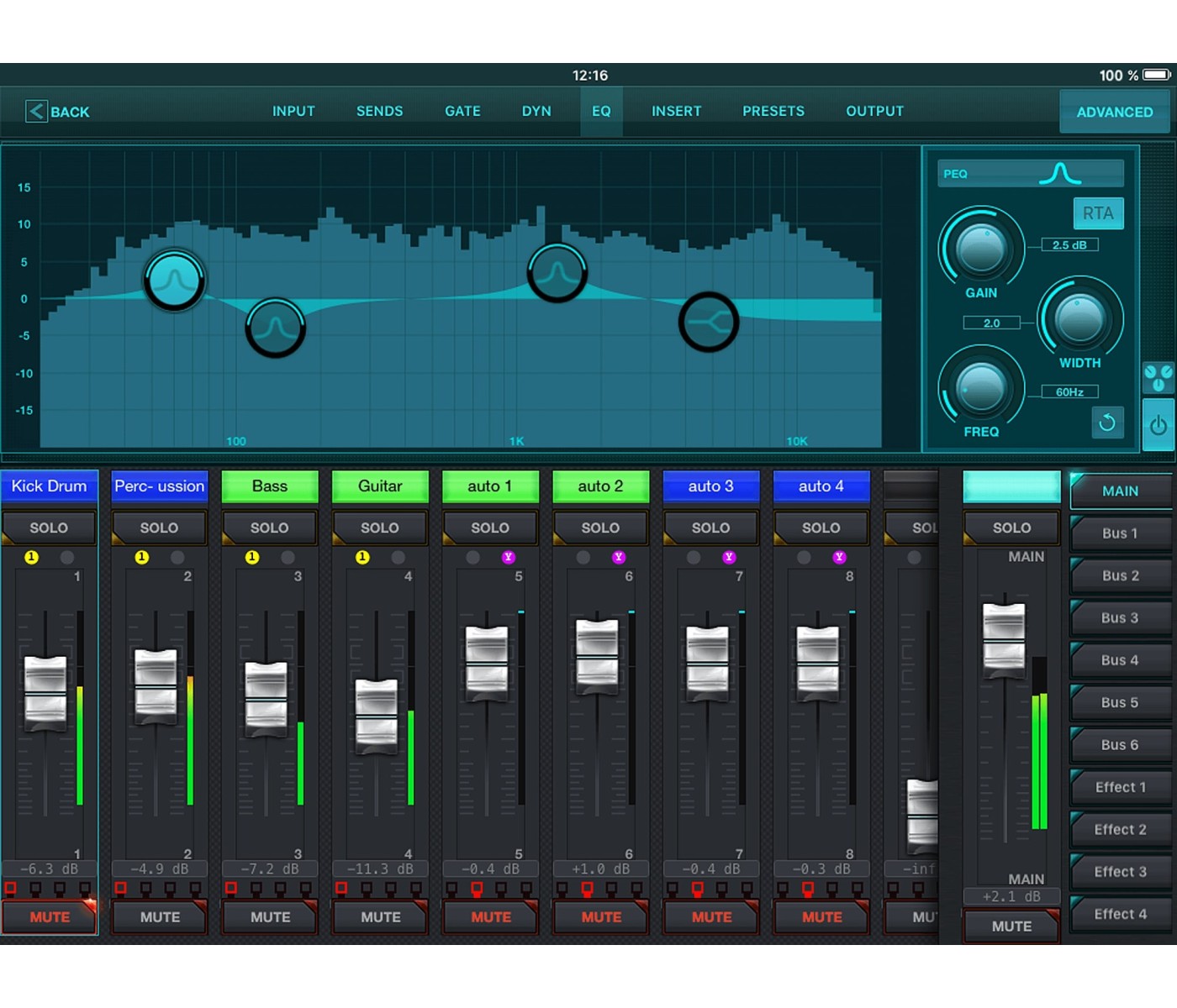 With so many variables beyond a mixer’s control, just how challenging mixing a live show can be. That’s why Behringer designed the XR18 with smart features that can make you a sound-mixing hero. The XR18’s channels are fully loaded, with per-channel low-cut filters, gates, full dynamics (including compression, limiting, expansion, ducking, sidechaining, and more) fully parametric 4-band EQ, and routing to the six aux outputs. When it comes to EQ, the XR18 lets you analyze the frequency content of your tracks courtesy of its 100-band Real Time Analyzer, built into every input channel, and then sculpt them with the bus equalizer. With visual feedback built right into the control app, you can see exactly what you need to do, and make fast, surgical adjustments to frequencies that need a boost or cut.