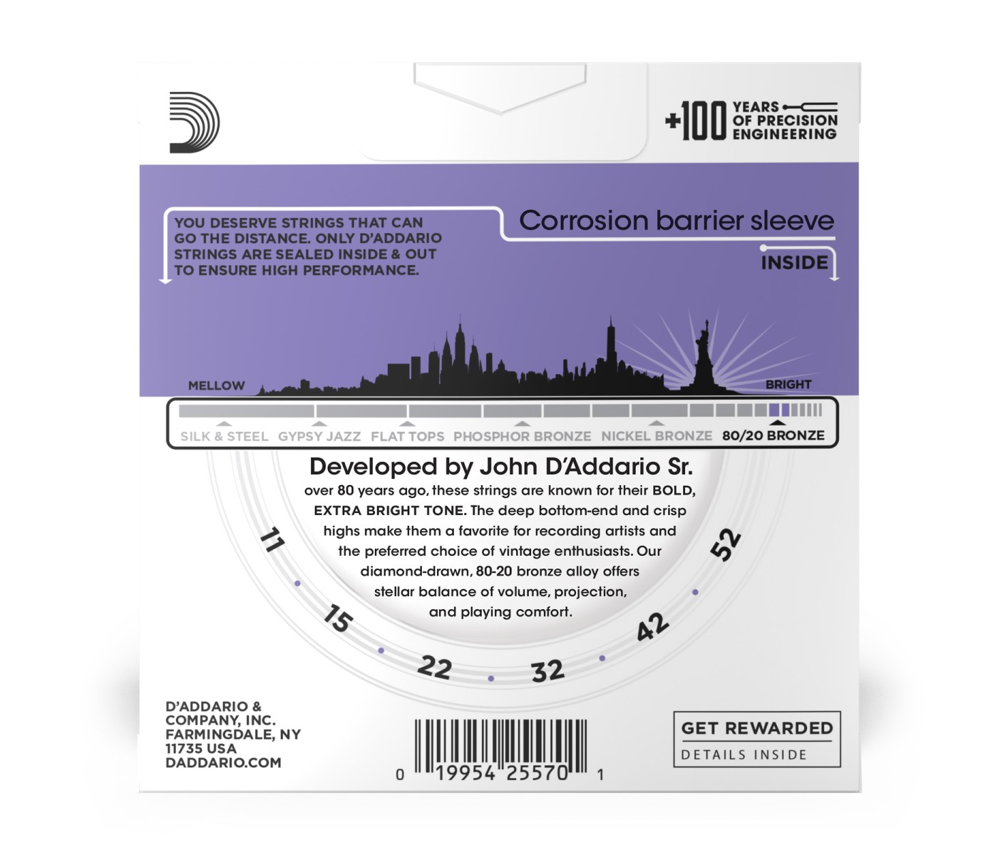 EXP11 is a light gauge 80/20 Bronze set that utilizes EXP coating for extended lifespan. 80/20 Bronze, the original acoustic alloy introduced by John D'Addario Sr. and John D'Angelico in the 1930s is a popular alloy for recording due to their crisp, deep and projecting tone and appeal to many traditionalists and vintage enthusiasts for their historical significance.
