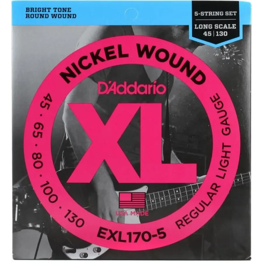 EXL170-5 is the 5-string version of the best-selling D’Addario bass set. With the addition of the .130 low B string, EXL170 offers the ideal combination of distinctive brightness and booming, tight lows. The most versatile and universally appealing set for all playing styles. Fits long-scale basses with a string scale length of up to 36 1/4 inches.