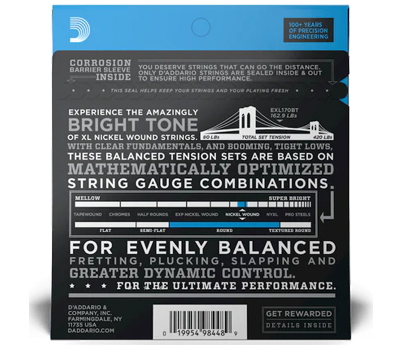 Available at Sadek Music, EXL170BT strings are perfect for bassists seeking consistent tension, superior playability, and classic XL Nickel tone.