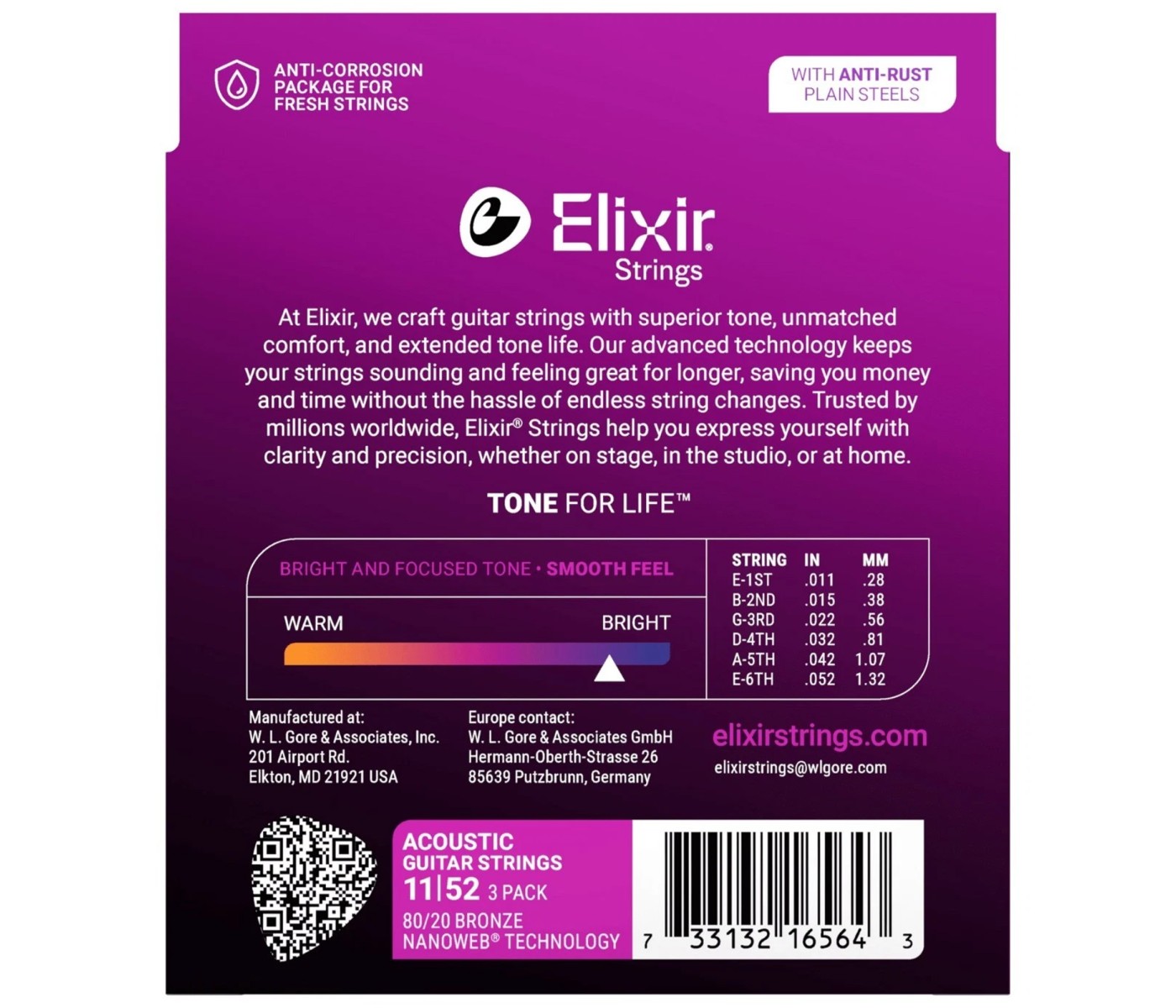 Elixir Strings 11027 Nanoweb 80/20 Acoustic Guitar Strings Custom Light - .011-.052 (3 Pack)  Elixir Strings 11027 Nanoweb 80/20 Acoustic Guitar Strings Custom Light - .011-.052 (3 Pack)