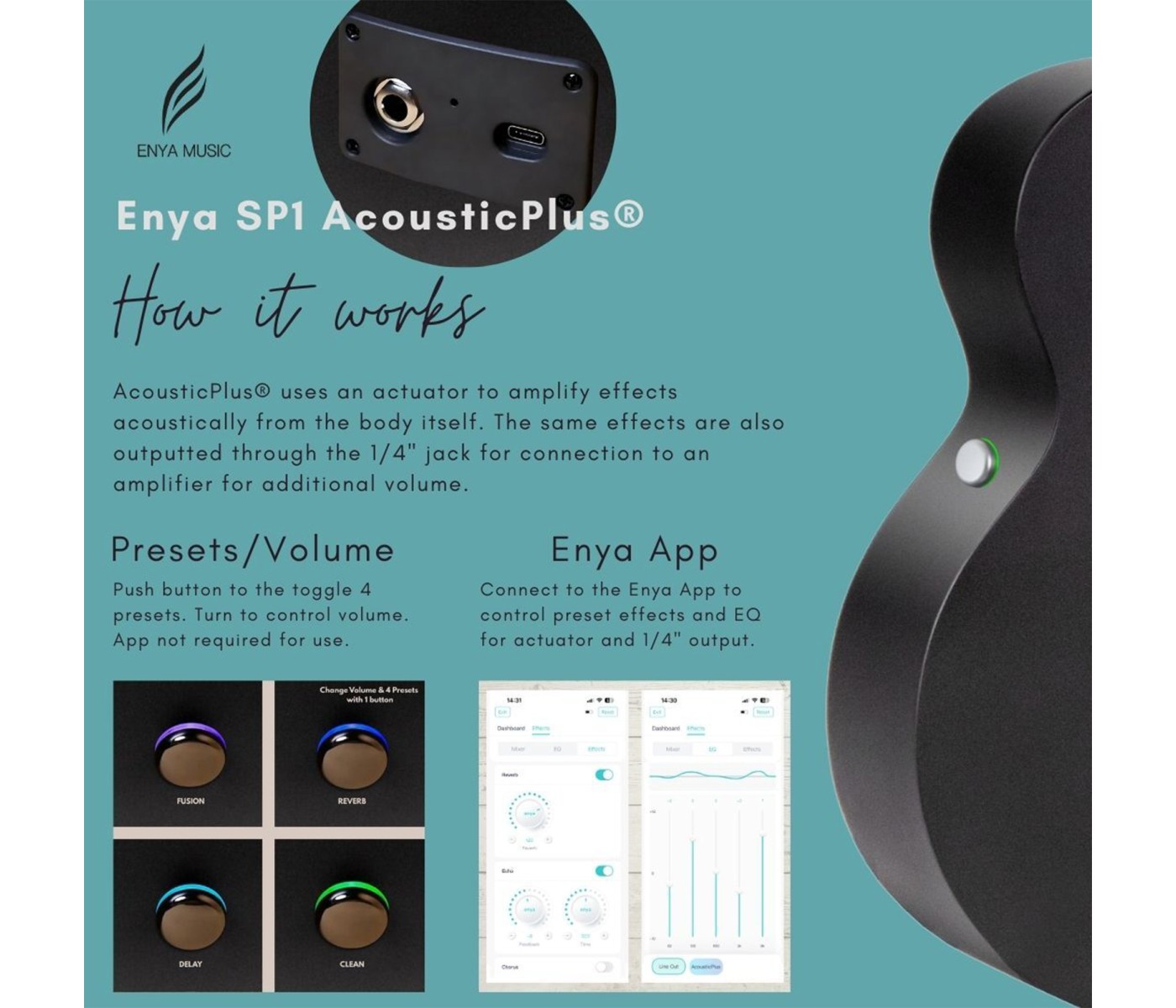 - SP1 AcousticPlus System: Features a built-in actuator that vibrates the guitar body to produce effects unplugged. It also includes Bluetooth connectivity for playing backing tracks and a USB-C port for charging and direct digital recording.