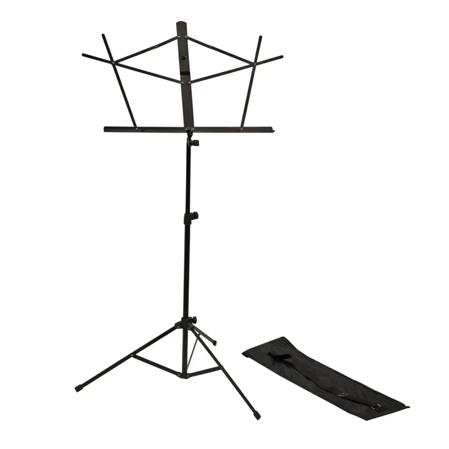 Rok-It folding sheet music stand with detachable bookplate, The leg assembly secures into place with a locking mechanism. Includes carry bag.