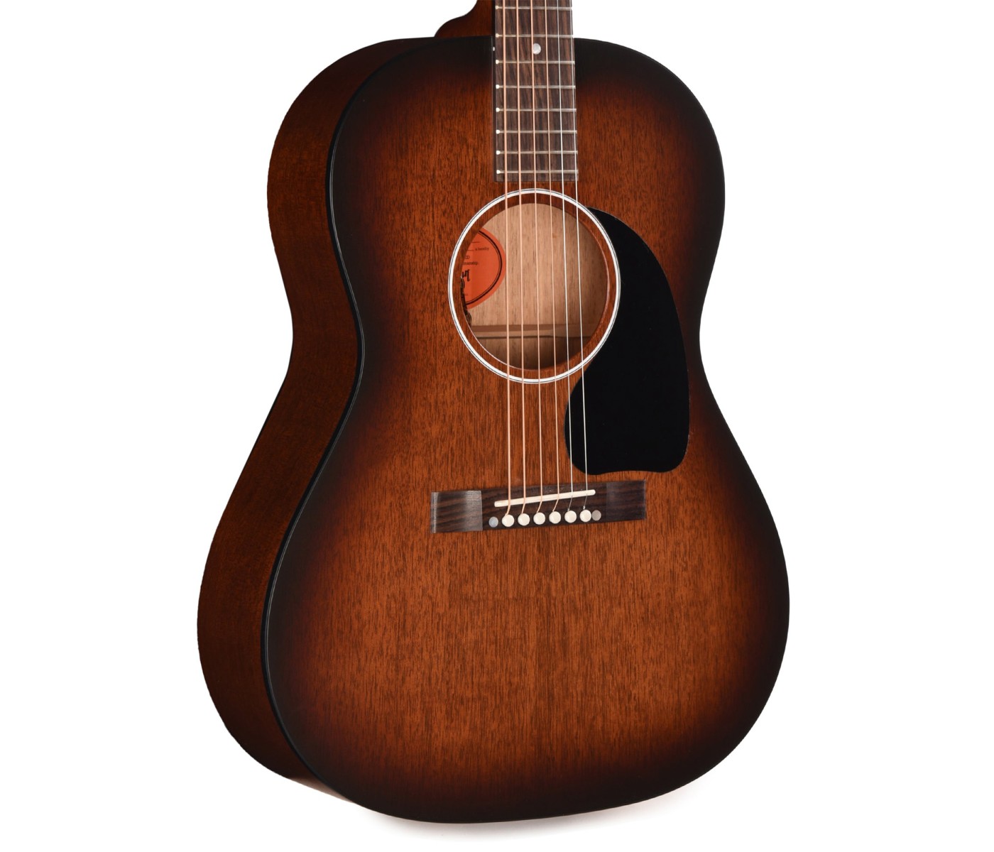 It is topped with an unbound rosewood fingerboard fitted with 20 standard frets and elegant mother-of-pearl dot inlays. The guitar also features a sloped rectangular closed-slot rosewood bridge with a bone saddle and TUSQ® bridge pins for optimal tone transfer. Reliable tuning stability is provided by **Grover strap tuners with white buttons, while the classic teardrop pickguard enhances the instrument’s vintage-inspired character. The all-mahogany construction produces a warmer, rounder, and smoother tone compared to guitars with spruce tops, making the LG-2 All-Mahogany Faded an excellent choice for folk, blues, and fingerstyle playing. Its compact body size also makes it especially comfortable to hold for long playing sessions. For modern performers, the guitar is factory-equipped with the **L.R. Baggs VTC under-saddle transducer and built-in preamp system. The VTC electronics feature soundhole-mounted volume and tone controls that are easily accessible to the player while remaining discreet to the audience.