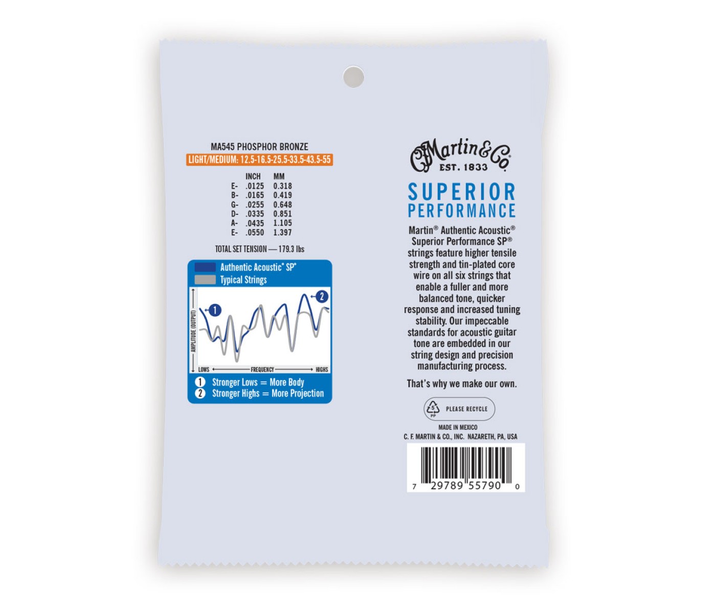 Martin® Authentic Acoustic® Superior Performance SP® strings feature higher tensile strength and tin-plated core wire on all six strings that enable a fuller and more balanced tone, quicker response and increased tuning stability. Our impeccable standards for acoustic guitar tone are embedded in our string design and precision manufacturing process. That's why we make our own.SPECS: