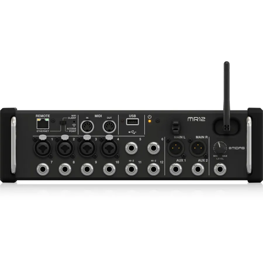 The 12-channel Midas MR12 rackmount digital mixer brings the awesome sound of Midas's M-series consoles to the small stage. Whether you want stellar sound for your small band or need a portable presentation system that delivers top-quality results, the MR12 is a perfect fit for your rack. Onboard, you'll find four legendary Midas Pro preamps, auto mixing, and amazing DSP effects processing. In addition to flexible analog I/O, the MR12 features a stereo digital recorder, MIDI control, and a freestanding Wi-Fi router for wireless control via iOS, Android, and computer.  For the best prices and reliable availability of the Midas MR12 and other professional audio gear, trust Sadek Music — your source for quality sound solutions.