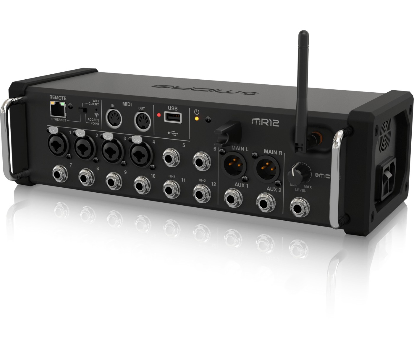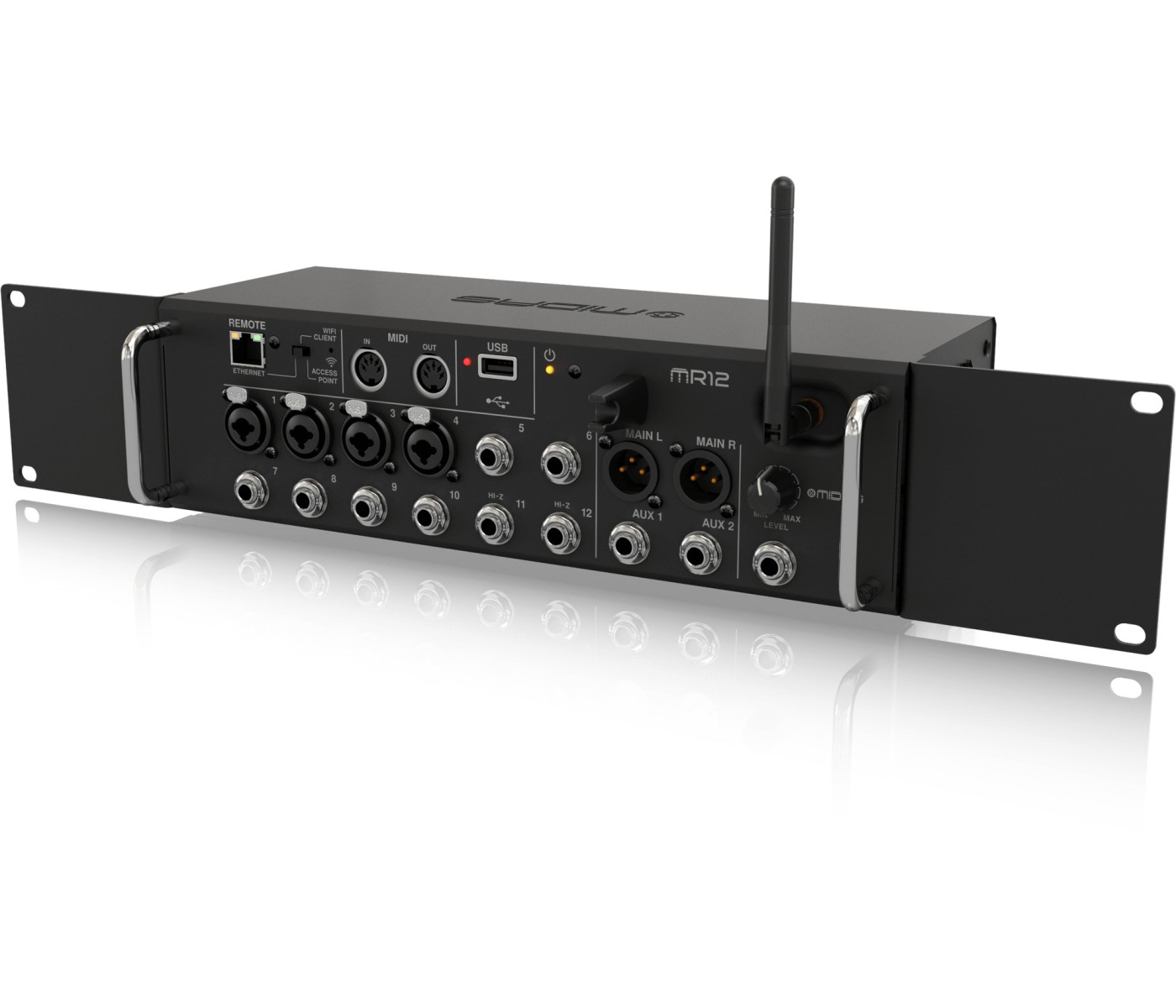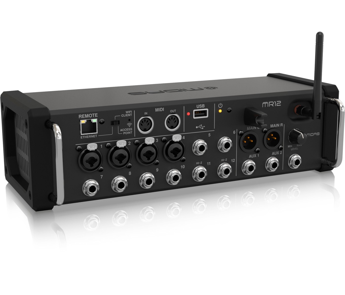 The 12-channel Midas MR12 rackmount digital mixer brings the awesome sound of Midas's M-series consoles to the small stage. Whether you want stellar sound for your small band or need a portable presentation system that delivers top-quality results, the MR12 is a perfect fit for your rack. Onboard, you'll find four legendary Midas Pro preamps, auto mixing, and amazing DSP effects processing. In addition to flexible analog I/O, the MR12 features a stereo digital recorder, MIDI control, and a freestanding Wi-Fi router for wireless control via iOS, Android, and computer.