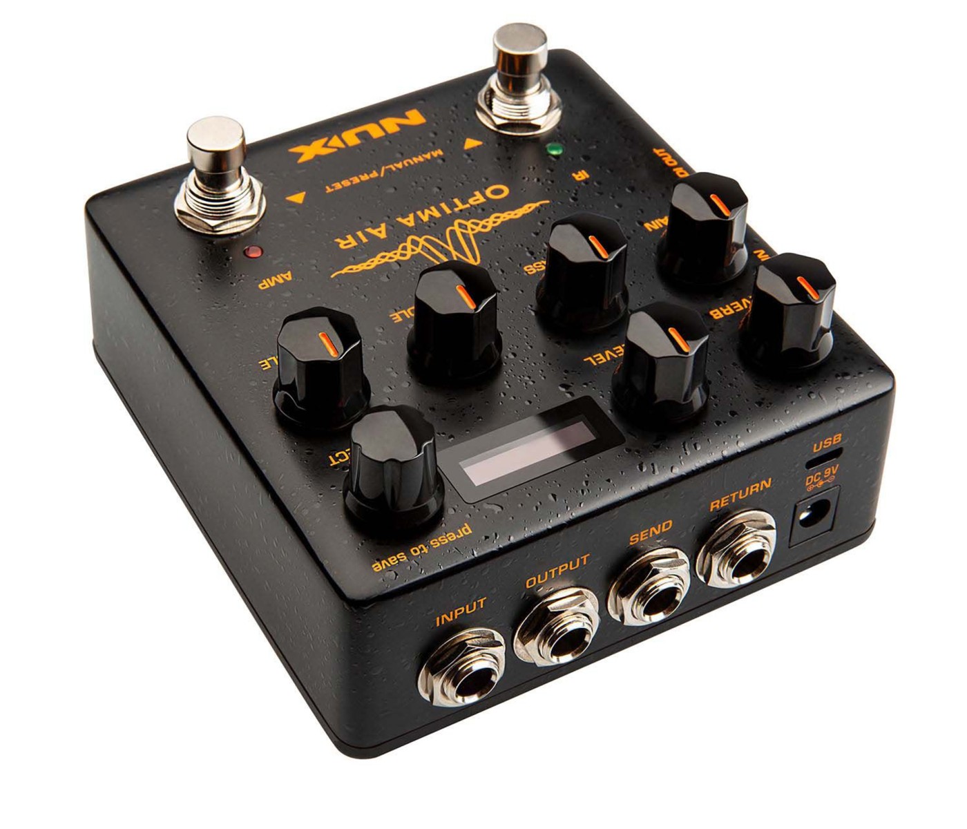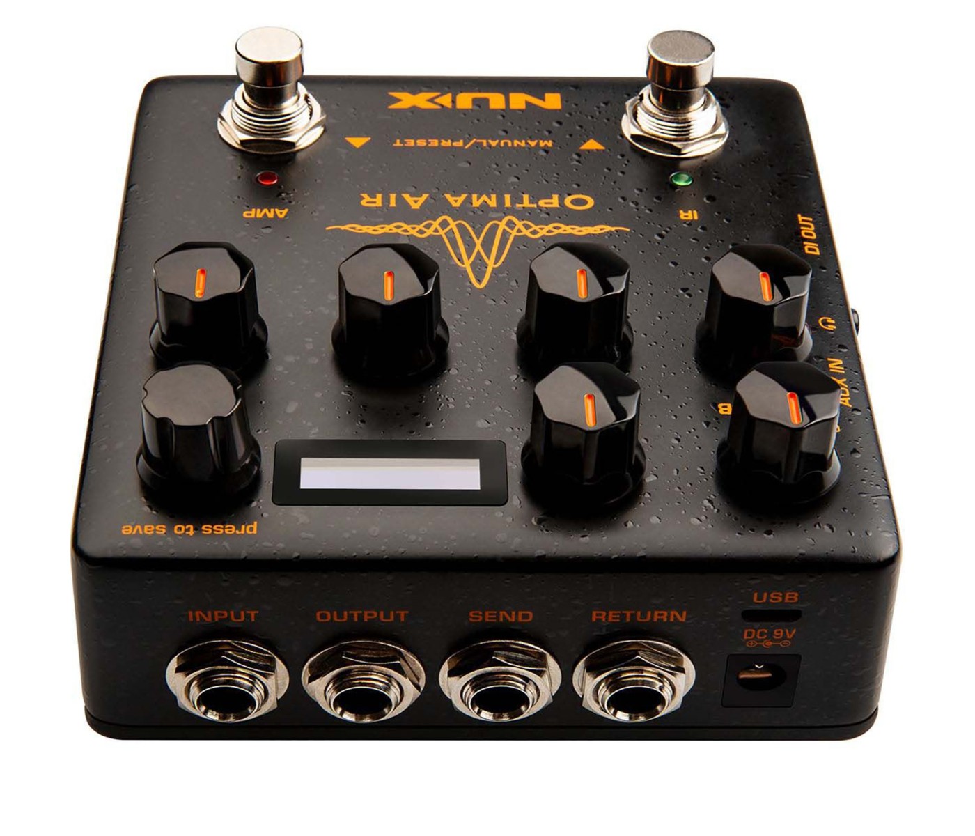 NUX Optima Air is a dual-switch acoustic guitar simulator with a preamp for acoustic and electric guitar players. It simulates the acoustic guitar profiles with the best-optimized sound depending on your guitar and pickup type. IR loader combined with a preamp which is equipped with 3-band EQ and Gain controls. And there is an additional one-knob-control Reverb effect. If you want to connect any effect pedal you can use the SEND/RETURN effect loop and add the Optima Air into the signal chain. NUX Optima Air has a unique profile capture function, you can create your own acoustic guitar profile (IR file) by capturing your favorite acoustic guitar's sound. There is an XLR DI output for direct line/mixer connection, headphones output for silent play and auxiliary input to connect a music player to play along.
