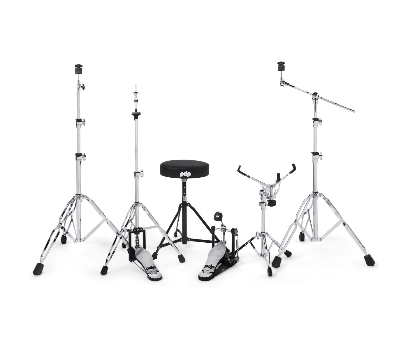 This hardware package includes a straight stand for your crash cymbal, a boom stand for your ride cymbal, a hi-hat stand, and a snare stand. Each stand is fitted with slide-resistant rubber feet and is fully adjustable, making it easy to accommodate drummers of any size and playing style.
