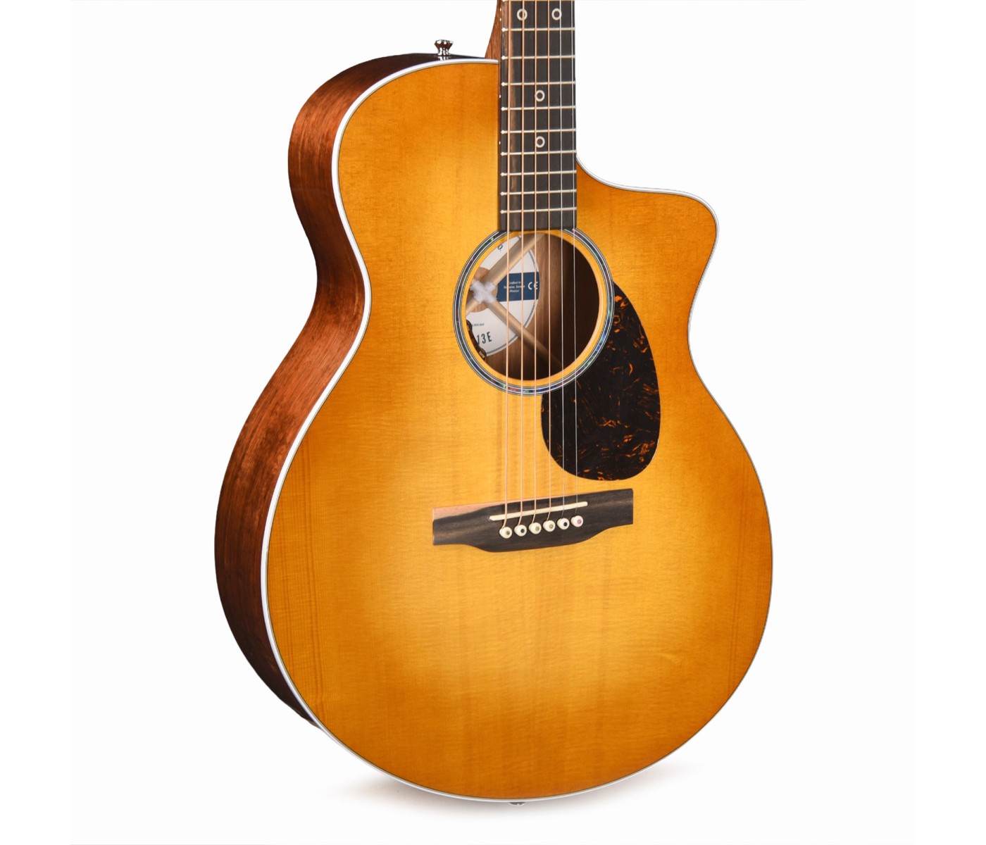 The Martin SC-13E Modern Mezcal Burst™ builds on the features of the SC-13E Modern with a striking sunburst top that adds bold visual character. It’s built for the same player who wants premium tone and unmatched playability, but with a stage-ready look that stands out under the lights. Like the SC-13E Modern, it pairs a solid spruce top with koa fine veneer back and sides for balanced tone, long sustain, and smooth highs. Scalloped X-bracing enhances responsiveness and clarity, while the SC body and Sure Align® neck system provide total fretboard access and modern comfort. Guitarists at Sadek Music appreciate the Low Profile Velocity neck, which plays fast and smooth, appealing to those who demand electric-like comfort from their acoustic.