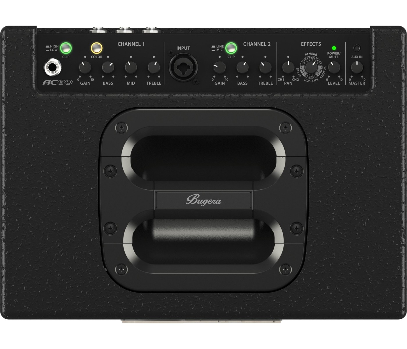 Bugera is proud to incorporate custom-engineered Klark Teknik effects into their products. We gave the AC60 a high-end, 24-Bit Multi-FX processor that features 16 incredible presets, such as reverb, modulation, delay and various other world-class effects combinations. Special attention was paid to the 7 awesome reverb programmes, which range from small rooms all the way up to the stunning reverberation of an immense cathedral – for the ultimate in live performance enhancement.