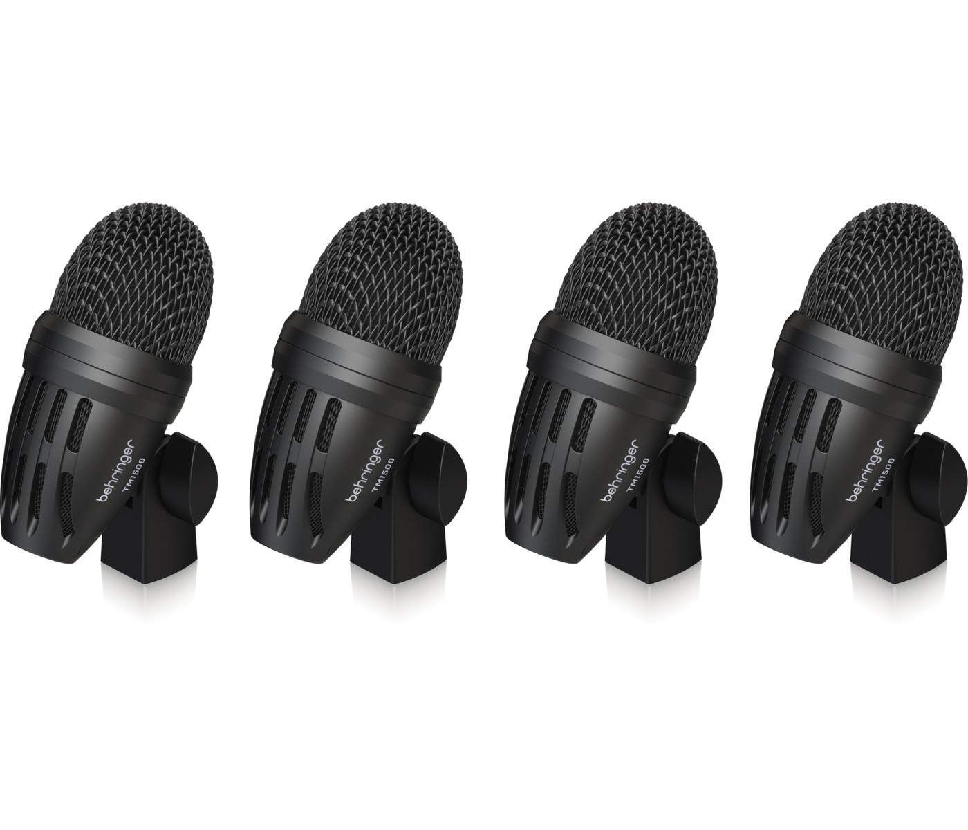 The TM1500 are high-quality medium diaphragm dynamic capsules especially tuned for full response of toms and snares. Mount clamps onto each mic, then attach each mic onto the hoop of a tom or snare drum. Angle and distance from mic to drumhead are adjustable. Position each mic toward the center of the drumhead for best results.