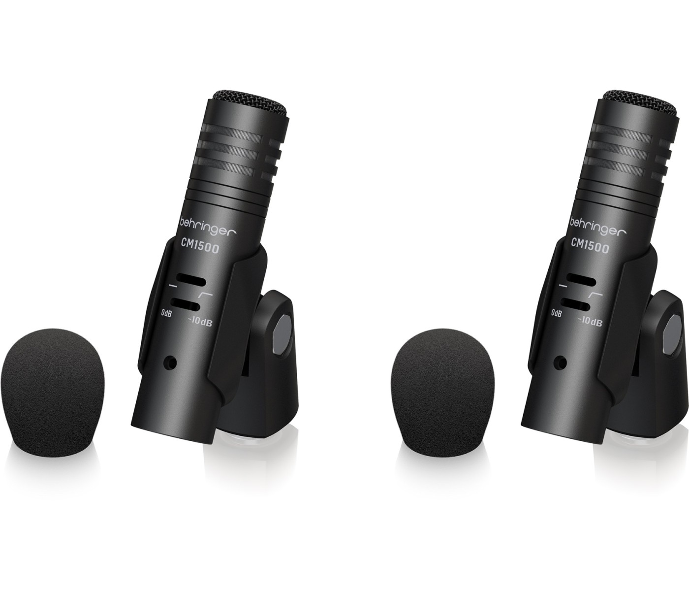 The CM1500 microphones, with built-in “10 dB pad” and “low frequency roll off," are directional small diaphragm condenser capsules especially tuned for full response of crash, hat and ride cymbals. Mount mic clips onto a pair of tripod boom stands. Slide these mics into the mic clips and position them to get desired delicate and silky highs.