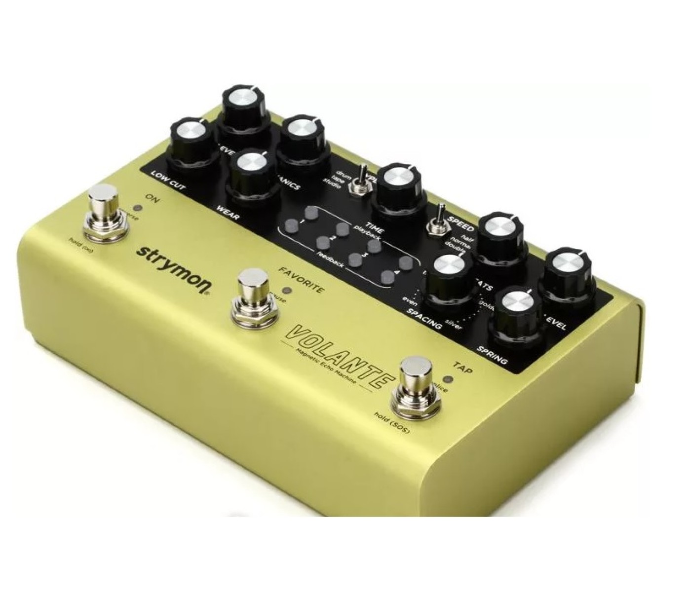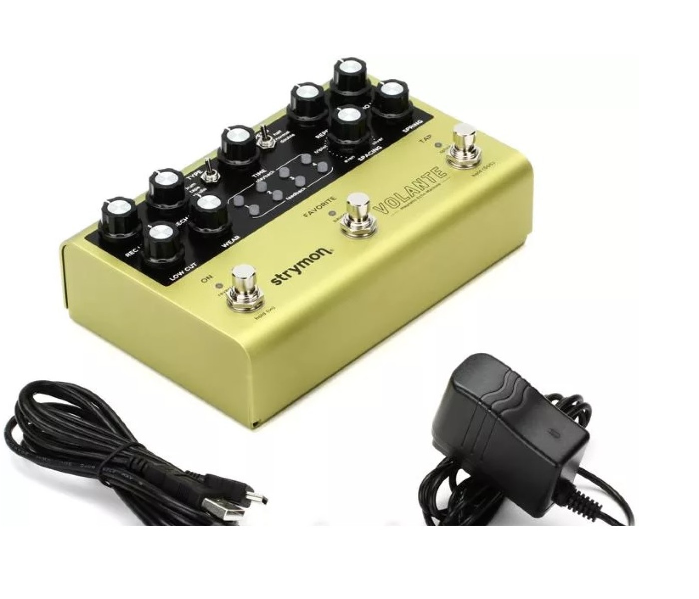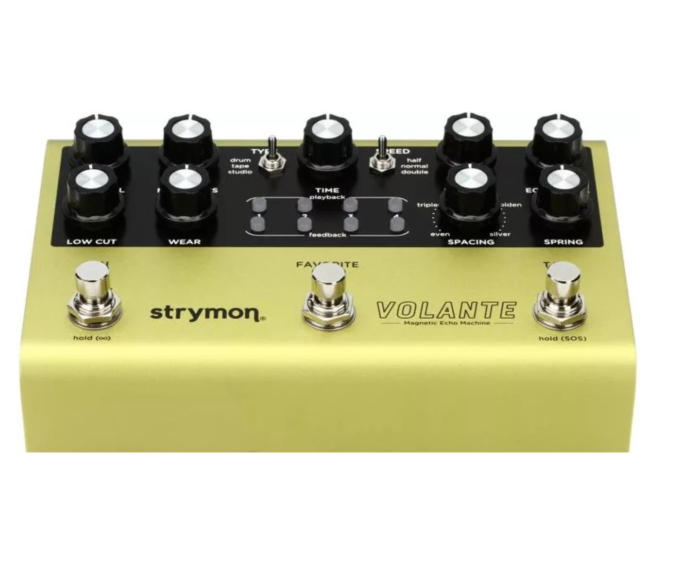 Strymon’s Volante delivers the full gamut of analog-style echoes — magnetic drum echo, tape echo, and reel-to-reel studio echo. It’s also a stereo multi-head delay with an onboard looper and independent vintage spring reverb. You can really dial in the vintage vibe with this pedal, from the natural saturation and soft clipping of overdriven magnetic media to mechanics, wear, head spacing, machine speed, and more. Enjoy complete control of every parameter via MIDI. Store up to 300 presets. Take command via expression pedal — Volante is primed for maximum emotional expression. Beyond that, instrument/line-level capabilities make it equally at home on your pedalboard or in the studio. Volante includes tap tempo, 24-bit/96kHz sound quality, and selectable true bypass/analog buffered bypass switching — it’s one of the most feature-packed delays on the market.