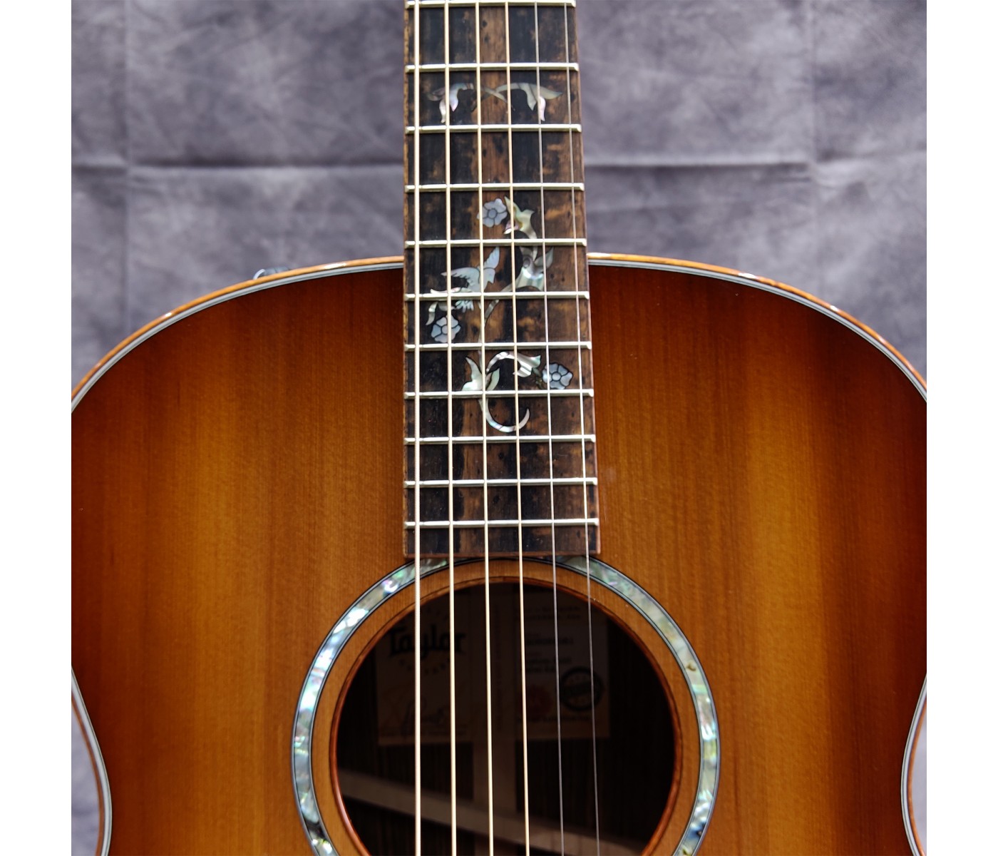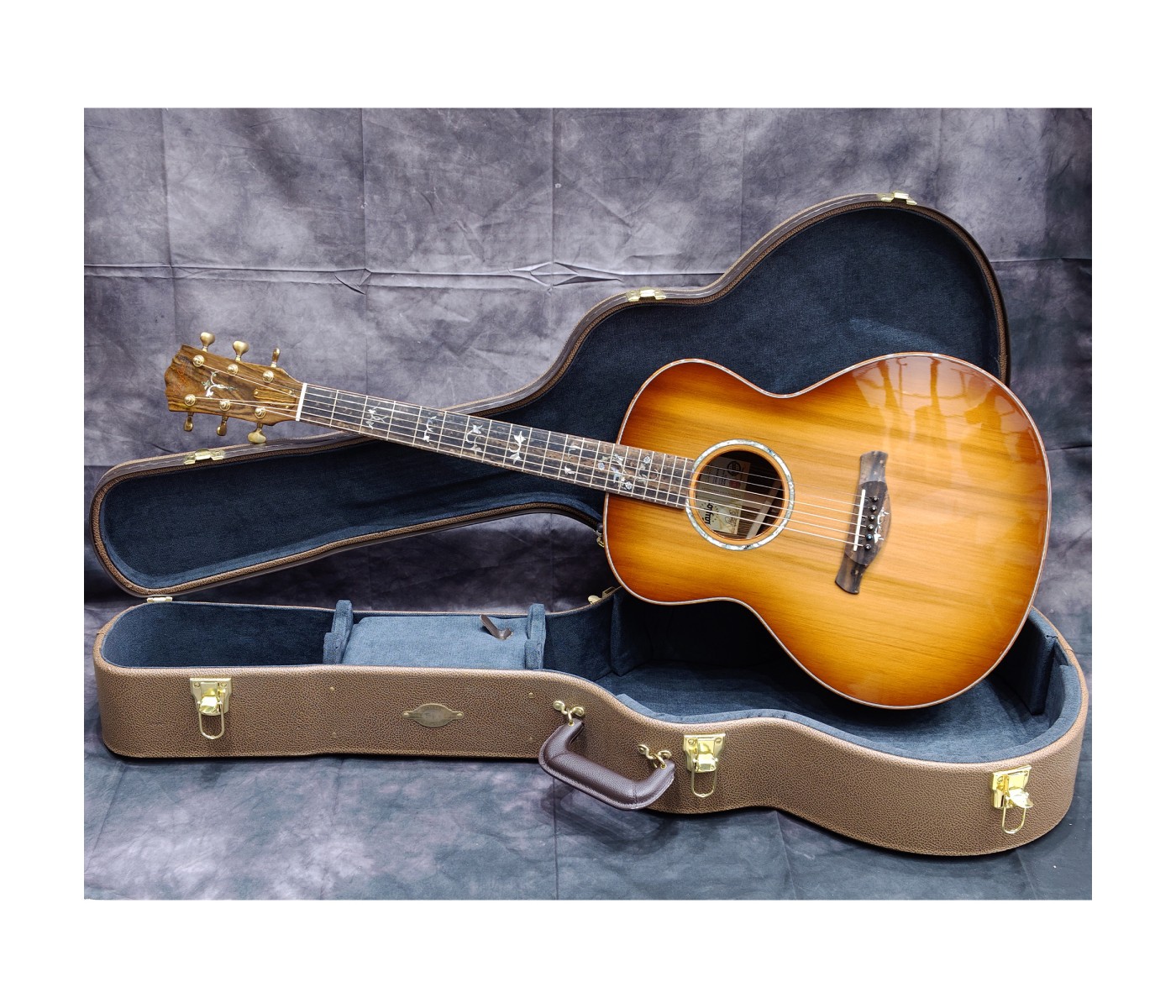 Experience the pinnacle of Taylor’s master luthiery, available through Sadek Music. This Custom Gold Label Grand Auditorium is the result of uncompromising artistry, where hand-selected tonewoods and intricate Cindy inlays converge to create an instrument that is as visually breathtaking as it is sonically inspiring. The Tonewoods: Exotic & Articulate At the heart of this custom build is a meticulously chosen Bocote back and sides set, prized for its dramatic grain patterns and warm, dense tonal character. Paired with a Striped Western Red Cedar top, the result is an immediately responsive, “played-in” feel with rich harmonic depth—perfectly suited for fingerstyle players and light strummers seeking nuance and expressiveness. The Visuals: A Masterpiece in Koa & Abalone Every detail of Custom #13069 reflects refined elegance. The body, fretboard, and peghead are bound in Figured Hawaiian Koa, forming a luminous frame around the stunning Shaded Edgeburst finish. The iconic Cindy Inlay—an intricate vine rendered in Abalone and Mother of Pearl—flows seamlessly across the fretboard, bridge, and peghead, elevating this guitar to true collector-grade artistry.